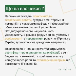 Запрошуємо учнів 9-11 класів та вчителів інформатики на ОНЛАЙН-форум “ІTodayWUNU”, на вас чекає насичений тиждень, практичної та теоретичної роботи, зустрічі з менторами ІТ компаній та лекторами кафедри інформаційно-обчислювальних систем і управління Західноукраїнського національного університету.