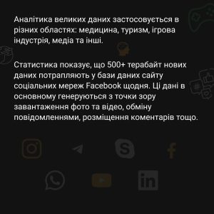 Аналітика великих даних застосовується в самих різних областях: медицина, туризм, ігрова індустрія, медіа та інші.
