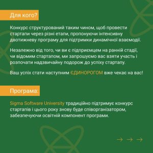 Освітня платформа Sigma Software University спільно з Sigma Software Labs та Українським Фондом Стартапів запустили UNICORN конкурс для стартапів: і запрошують до участі усіх, хто має креативні ідеї та хоче їх перетворити у успішний стартап. Захід проходить за підтримки Міністерства освіти і науки України.