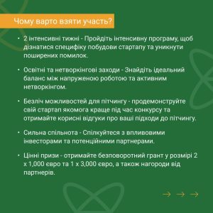 – Безліч можливостей для пітчингу – продемонструйте свій стартап якомога краще під час конкурсу та отримайте корисні відгуки про ваші підходи до пітчингу.