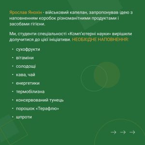Ми, студенти спеціальності “Компʼютерні науки” вирішили долучитися до цієї ініціативи. Тому з 30 жовтня до 3 листопада організовуємо збір необхідного наповнення, а саме: