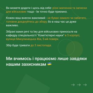 Зібрані вами речі та їжу для військових приносьте на кафедру спеціальності “Комп’ютерні науки” в 5 корпусі.