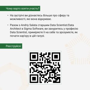 На зустрічі ви дізнаєтесь більше про сферу та можливості, які вона відкриває. Разом з Andriy Salata старшим Data Scientist/Data Architect в Sigma Software, ви зануритесь у професію Data Scientist, приміряєте її на себе та зрозумієте, як почати кар’єру в цій галузі.