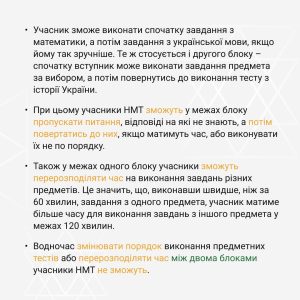 За її словами, під час виконання першого блоку тестів з української мови та математики, а також другого блоку тестів з історії України та предмета за вибором учасники НМТ зможуть самостійно обирати у межах блоку порядок виконання предметних тестів.