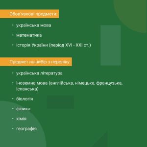 Окрім цього, зазначеним наказом затверджено перелік навчальних предметів, із яких відбудеться тестування. Також передбачено, що НМТ міститиме два блоки: основний, до якого увійдуть три обов’язкові навчальні предмети, і додатковий, що міститиме завдання з одного навчального предмета на вибір. Обов’язкові — українська мова, математика та історія України, на вибір — українська література, іноземна мова (англійська, іспанська, німецька, французька), біологія, фізика, хімія та географія.