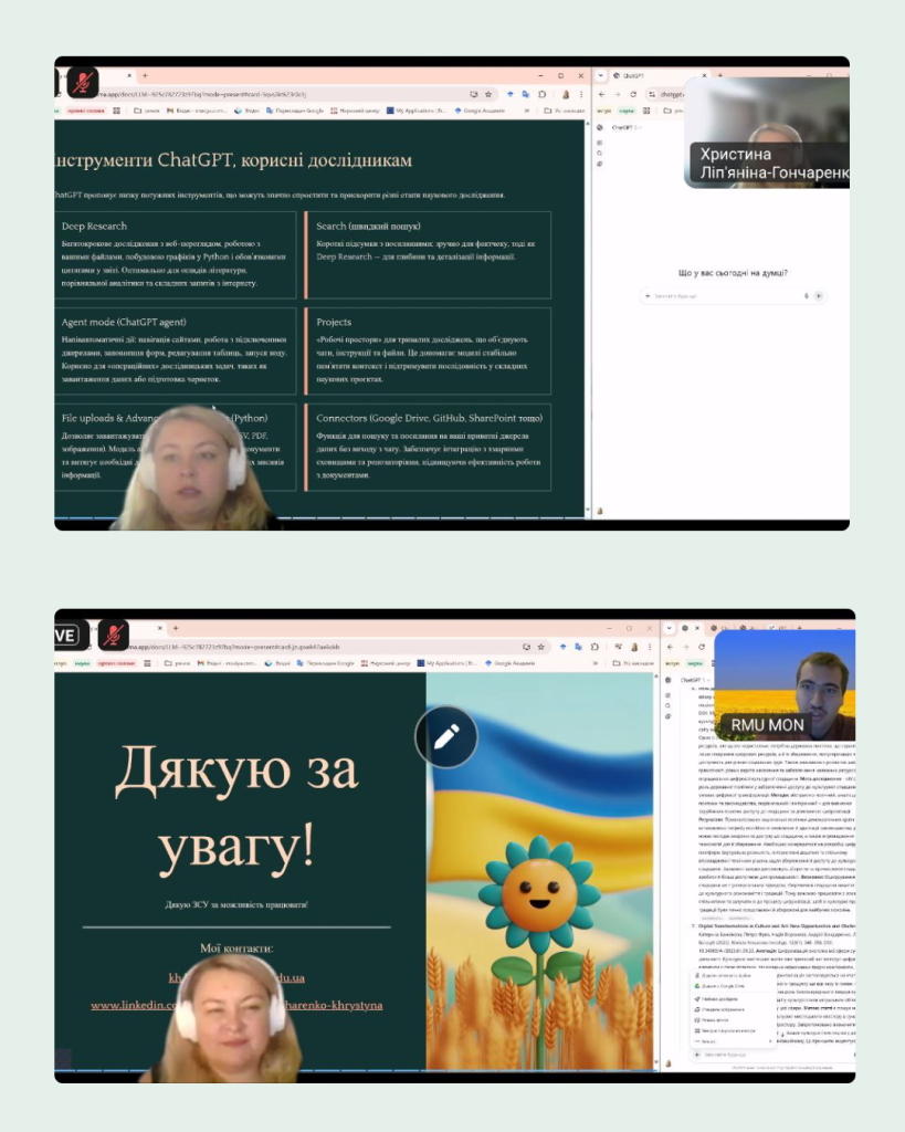 22 вересня 2025 року відбулася лекція на тему «LLM у науці: як використовувати GPT від літературного огляду до результатів», яку провела Христина Ліп’яніна-Гончаренко, доктор технічних наук, викладач кафедри інформаційно-обчислювальних систем і управління Західноукраїнського національного університету.